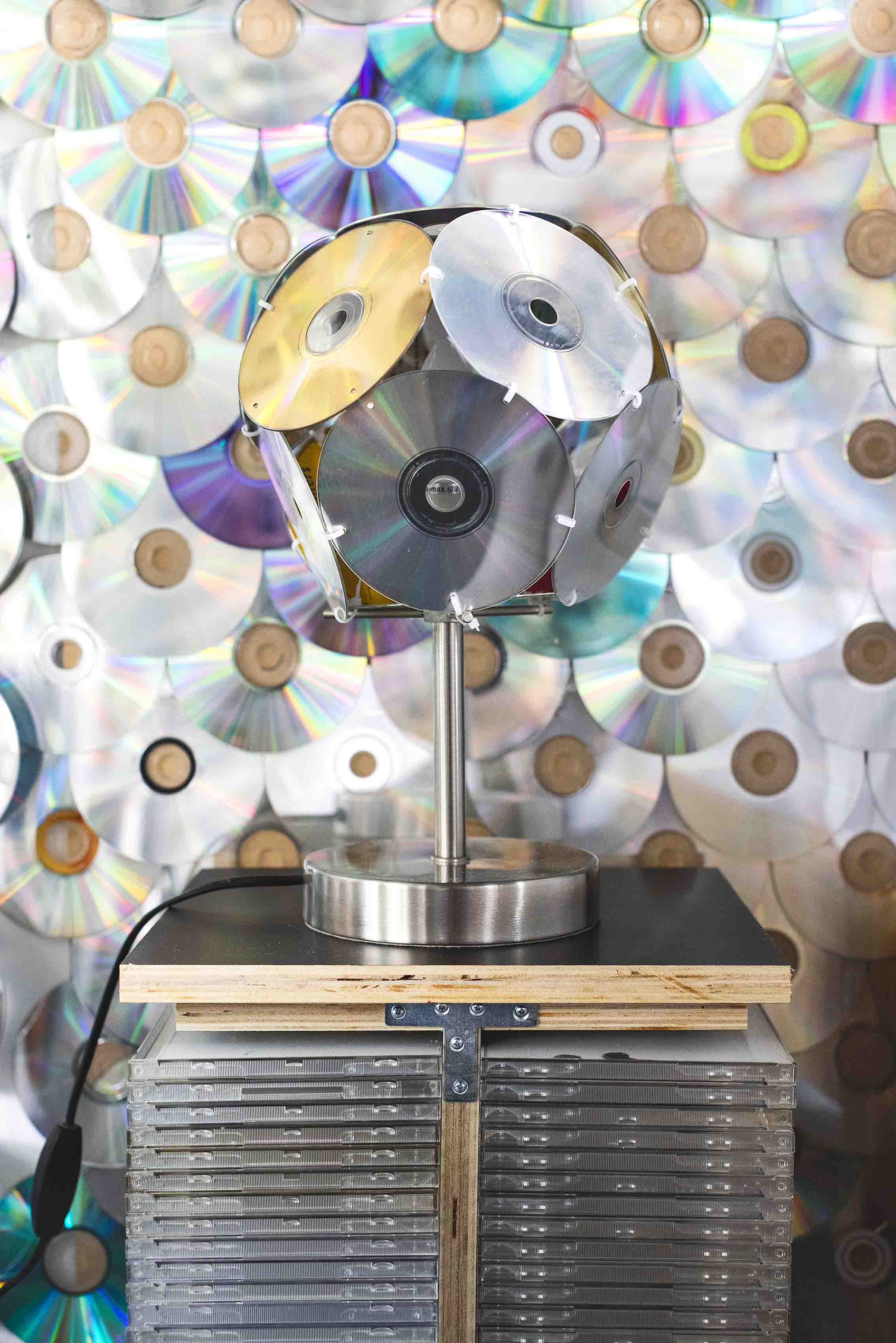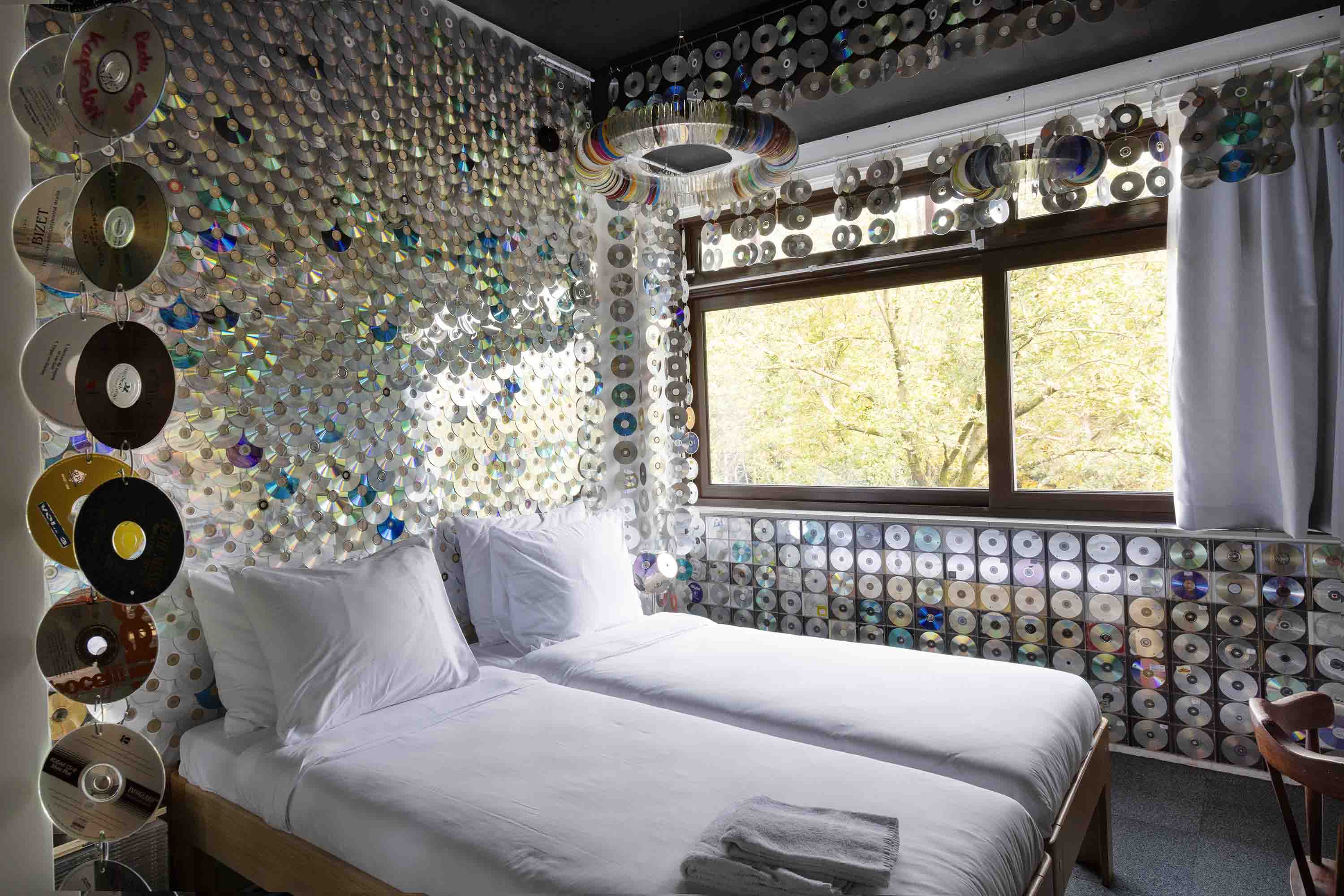 De Groene Afslag is een circulaire hub en ontmoetingsplek in Het Gooi waar duurzaamheid, kunst en creativiteit samenkomen. Vanuit een voormalig militair complex bieden ze ruimte voor verandering – met een restaurant, vergaderzalen, werkplaats, school én dertig kunstzinnige hotelkamers. Eén van de kunstkamers is CD-Room, gemaakt van duizenden oude cd’s. Deze kamer laat zien hoe afgedankt materiaal nieuw leven krijgt. Glimmende schijfjes sieren muren en plafond, cd-hoesjes zijn meubels geworden en zelfs de verlichting is van cd’s gemaakt. CD-Room maakt bezoekers bewust van de waarde van hergebruik en laat op verrassende wijze zien dat afval in een circulaire wereld niet bestaat.
